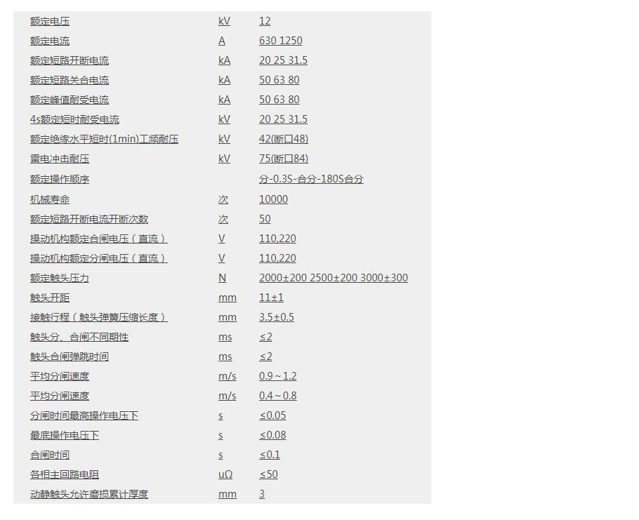 VS1-12真空斷路器技術參數